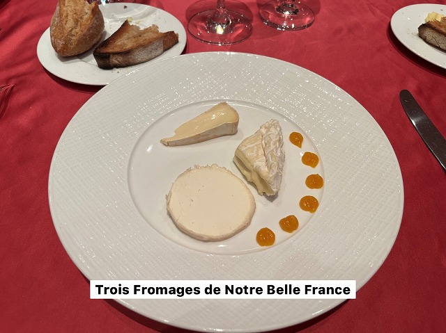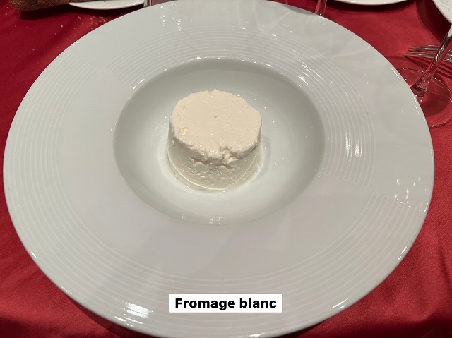 チーズは3種類、ルブロッション・ド・サヴォワ、サン・マルスラン、シャロレにアプリコットのピューレが添えられます。お腹いっぱいの私はフロマージュ・ブランで。