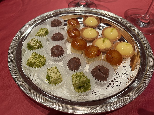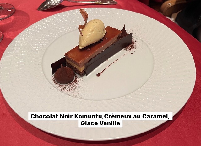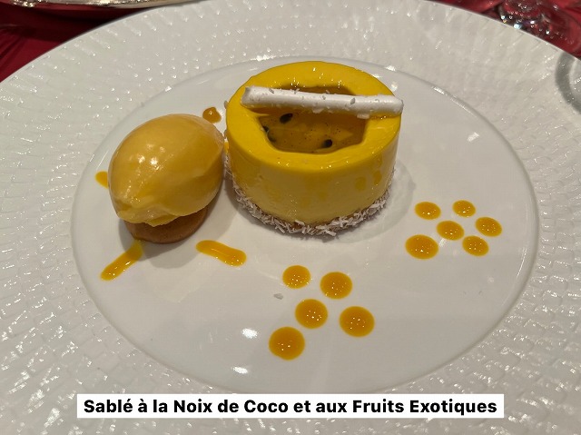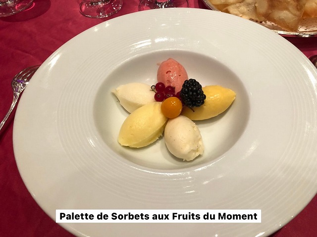 エキゾチックのフルーツを使ったムースとシャーベット、ソルベの盛り合わせ、チョコレートとキャラメルのムースをいただきました。
