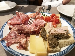 トマトをのせたブルスケッタ、カッラーラ近郊で作られる特産物ラルド(豚の脂身を香草と一緒に塩漬けしたものを薄く切って食べます)、トスカーナ風クロスティーニ(粗く刻んだレバーペースト)、ペコリーノ・チーズ(羊乳を使っているので旨みの濃縮加減がたまらない。)、ソープラッサータ(豚の顔や耳の部分を茹でて煮凝りにして固めたもの。)、フィノッキオーナ(フェンネルシードを混ぜ込んだソフトサラミ)、プロシュット・トスカーナなど。