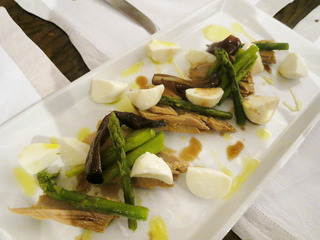 アスパラガス、ツナ、ボッコンシチーノ(一口サイズのモッツァレッラ)のサラダ。黒っぽいのが甘酸っぱい葉玉ねぎで良いアクセントになってます。シンプルですがバランスの取れた1皿。
