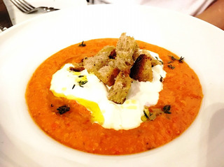 パンツァネッラとはパンのサラダの事ですが、"A MODO NOSTRO"私たちのスタイルということで、全く想像できなかったものが出てきました。タイム風味のフレッシュトマトのスープ仕立てで、チーズ風味のムースの上にクルトンの様な感じでパンが乗っています。見た目よりもさっぱりと頂けます。