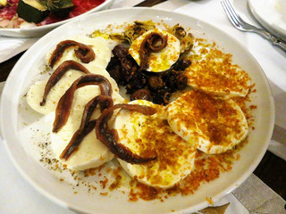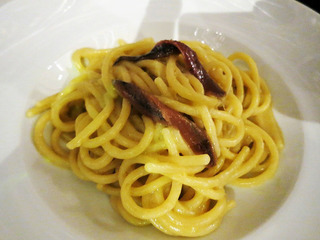 水牛のモッツァレッラをアンチョビ、ボッタルガと共にいただきます。モッツァレッラをそのまま食べるとミルクの風味が余韻として残ります。出来立てに近いのか少し歯ごたえがあります。ボッタルガも美味しいのですが、合わせてあるアンチョビがまた美味しい。もちろん両方合わせるとさらに旨い!