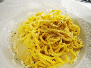 トンネッリ(手打ちパスタの一種)にたっぷりのカッチョ(チーズ)とペーペ(胡椒)を合わせたシンプルな一品。ペコリーノ・ロマーノとパルミジャーノ・レッジャーノの旨味がダイレクトに味わえます。個人的にはもっと胡椒があっても良かった。