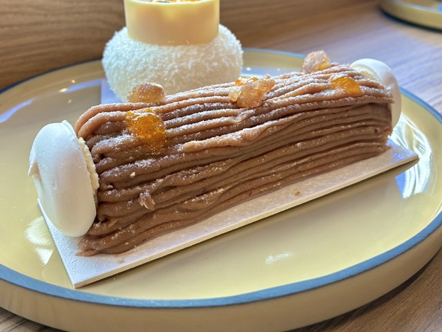 コルシカ産のクレモンティーヌ(小ぶりで甘いみかん)と濃厚なマロンクリームを合わせたモンブラン。栗は柑橘類とも相性が良く、今回使用されているクレモンティーヌと濃厚なマロンクリームはすっきり爽やかにまとまっていて食べやすかったです。中にはホワイトチョコレートでコーティングされた乾燥メレンゲが入っていました。