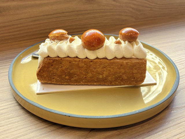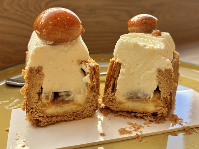 キャラメリゼしたパイ生地の中にクレム・パティシエールとキャラメルソース、上にバニラ風味の軽いクリームを絞り、表面にはキャラメルをコーティングしたシュー生地が乗っています。パイ生地が見た目の印象よりもホロホロしており、キャラメリゼされていて香ばしく美味しかったです。ほろ苦いキャラメルソースも、甘いクリームとの相性が抜群でした。シュー生地の表面のキャラメルが薄く、食感もよくて見た目も綺麗。