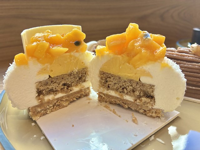 南国のフルーツであるココナッツ、マンゴー、パッションを組み合わせたムースです。底にはザクザクしたクルスティアン、甘くて優しい風味のココナッツの柔らかいムース、フレッシュのマンゴーの角切りなど食感が楽しい一品でした。ココナッツやマンゴーの甘みと、パッションフルーツの酸味のバランスがとても良かったです。丸いフォルムで見た目もかわいらしく仕上げられています。