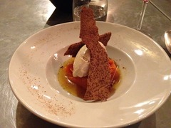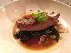 フォワといえばエスカロップ状のものが定番ですが、この形のフォワに出会ったのは初めてでした。ギヨーム・ヴェルダン氏について調べたところ、ブルゴーニュの生産者ということで、生産者から直接仕入れた食材は、この肉厚にして非常にやわらかく、臭みもなく、ジャストな塩加減で絶品でした。