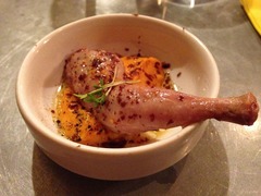 この日のアミューズはウズラのもも肉のコンフィ。 手でつまんでかじると肉がすんなり外れるくらい火を通してあるので、食べやすく、まぶしてあるコーヒー豆が香ばしいアクセントになっていました。