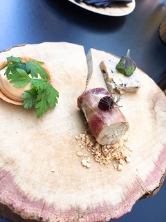 左から白いんげん豆のタルト、アーティチョークのピュレを詰めた生ハム、パセリとピスタチオを入れた豚のテリーヌ。