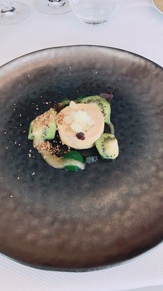 キウイを入れ低温で火を通したフォワグラ、爽やかな青臭さを持つ山セロリのピュレ