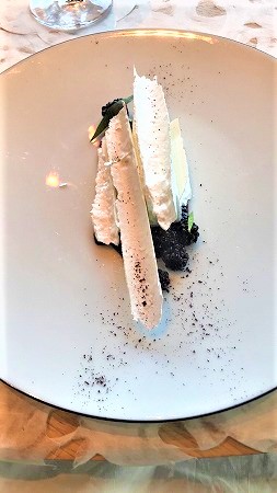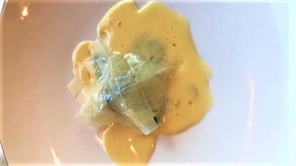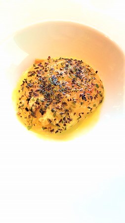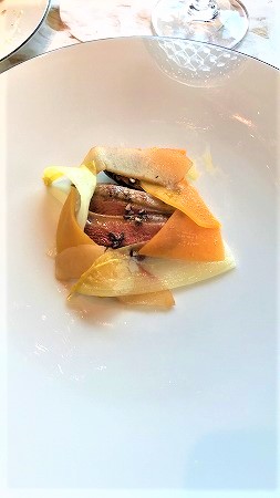 ソースは燻製がかったサバイヨン。レモンやケイパーなどのアクセントもありとても面白い組み合わせです。