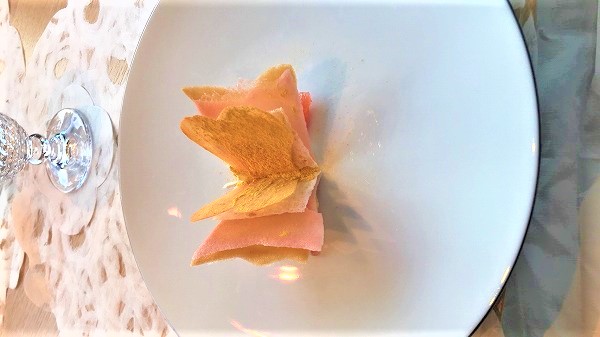 蜂蜜とグリオットのムース、ラングドシャ、サツマイモのチュイル、シトロンのコンフィが薄い層になっており、セルビスが目の前で一刀入れてパピヨン(蝶)の形に仕上げてくれます。