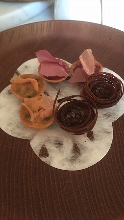 プティフールはパッションと生姜、フランボワーズ酢とキャラメル、ショコラと唐辛子の