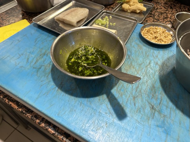 こちらの料理はつけ合わせやソースに、モヤシや米酢、生姜など、アジアのテイストを取り入れた料理です。スズキは1人前のサイズに切り分けて、身にパクチーの茎を刺し込んでスズキに香りを付けながら焼いて火を通します。