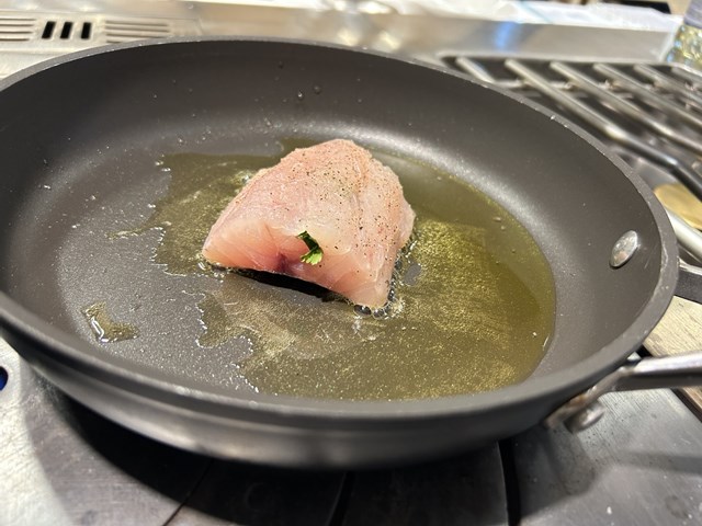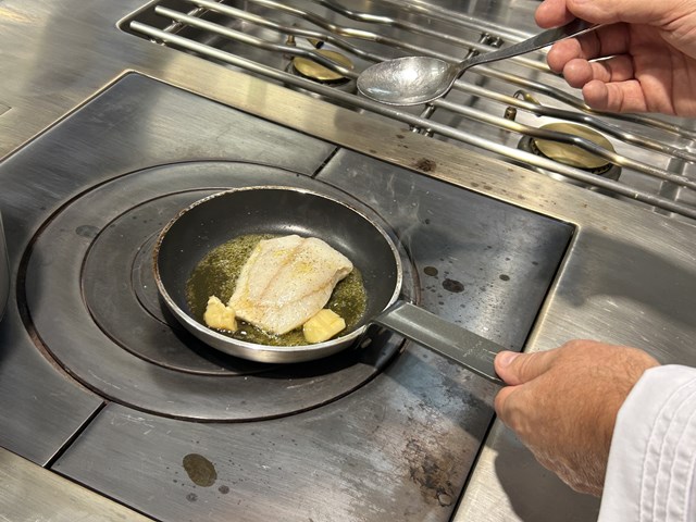 次にテュルボですが、こちらはポワレにします。まずオリーブ油で焼いていき、途中でブール・ノワゼットを加えて、テュルボにかけながら火を通していきます。焼きあがれば西洋わさび、粉末状のケイパー、シトロンキャビアを振りかけて、ピューレ、ソース、テュルボの順に盛りつけて完成になります。