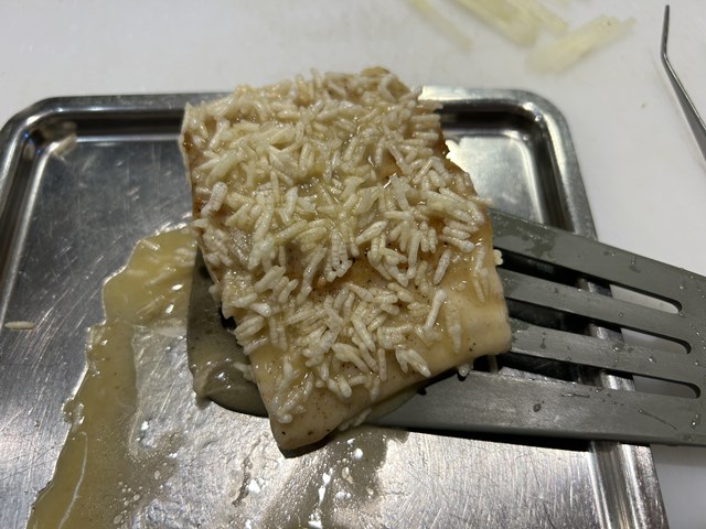 そのあとエシャロット、白ワイン、米酢、生クリームを煮詰めて漉したグラサージュを表面に塗り、そこに火を通して乾燥させ揚げた米を振りかけます。