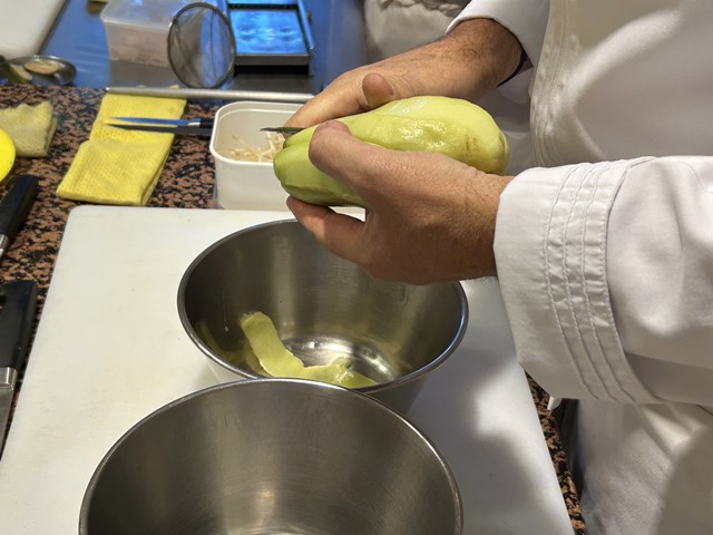 テュルボとはイシビラメを指し、白身で繊細な味わいで魚の王様とも言われ、昔から様々に調理されてきた魚です。今回テュルボはポワレにし、セロリと合わせました。まずつけ合わせは根セロリのピューレです。根セロリを小さく切り、生クリームで火を通します。火が通ればミキサーにかけてピューレにします。次にソースですが、今回は常温のソースです。セロリの葉、セロリの角切り、クルミ、エシャロットをシードルヴィネガーとセロリオイルで漬けたソースになります。