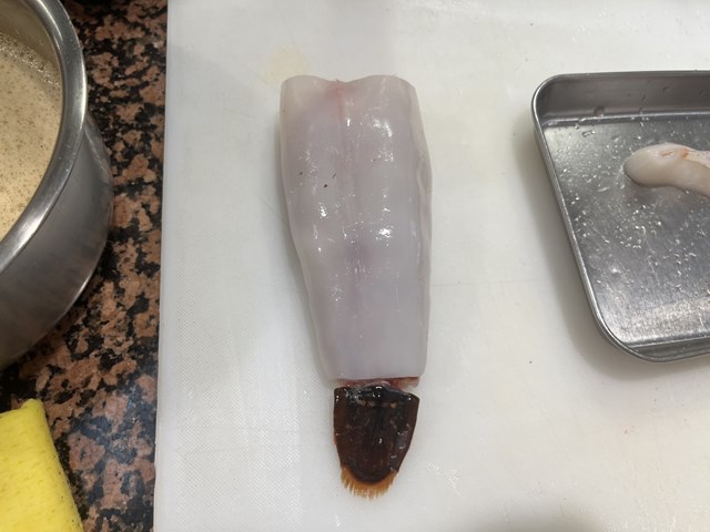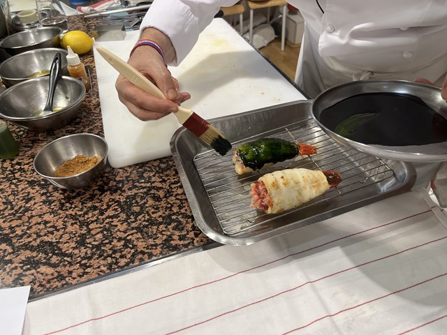 イカを下処理し、きれいなむき身にしたものの中にオマール海老の身を詰めてロース糸で固定します。イカの表面にオマール海老のコライユ(生殖巣)を塗り、バーナーであぶり、フライパンで澄ましバターを溶かして焼きます。火を入れることで緑色のコライユが鮮やかなオレンジ色に変わっていきます。