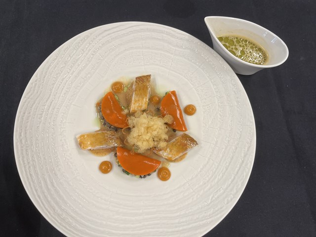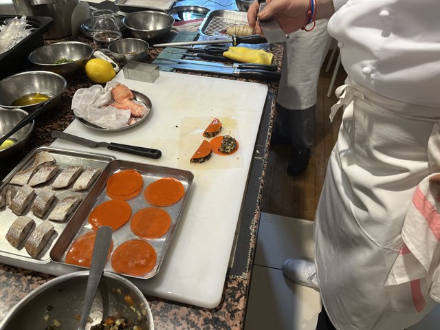 1品目はルジェという魚を使った料理です。身が柔らかく扱いが難しいですが、味が濃くとてもおいしい魚です。下処理をしたルジェに塩、こしょう、エスプレット唐辛子で味付けをし、水で濡らしてオリーブオイルを塗ったリードペーパーで巻いてから、65℃のスチームコンベクションオーブンで芯温44℃になるまで火を通します。火が通れば氷水に落として水気を切り、4等分にカットします。
