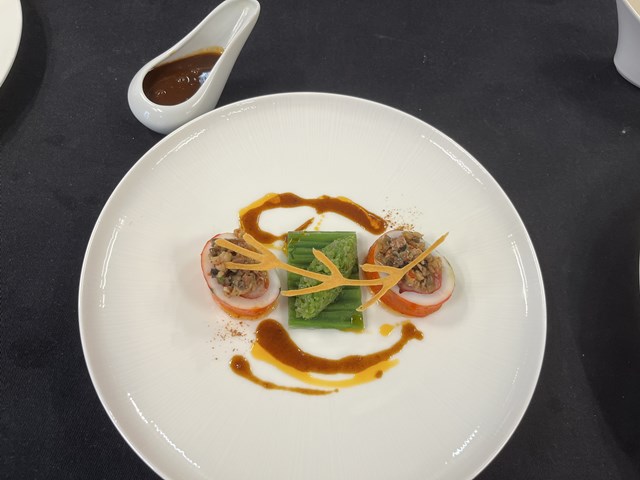 Homard bleu et encornet Haricots verts et jaunes relevé d'un condiment xo,
