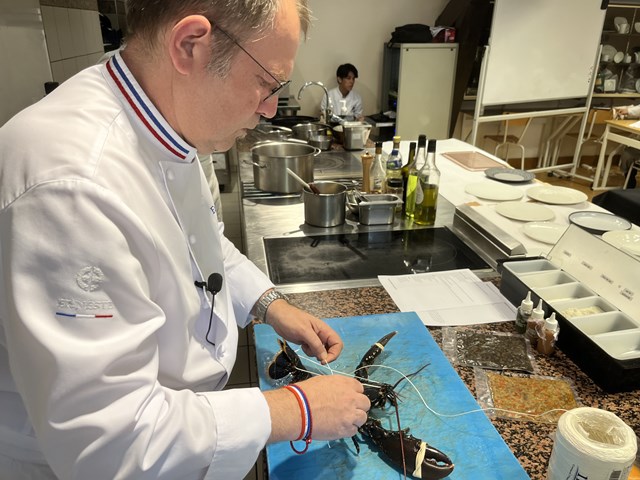 2品目はオマール海老を使った料理です。オマール海老をひもで巻いて固定し、さっと湯がいて氷水に落とします。殻を外して身を取り出し、外した殻と香味野菜、八角、オレンジの皮などを加えてソースを作ります。
