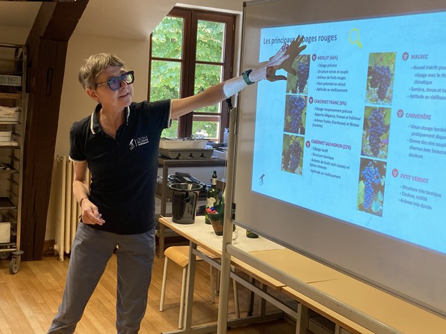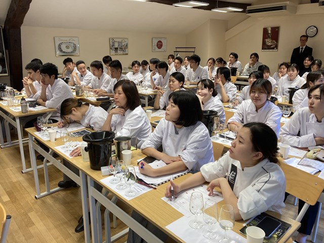 フランスワインについてたくさんの種類を学んだフランス校での授業でしたが、今期最後の専門講習はボルドーワインについての講習でした。ボルドーワイン委員会(CIVB)の講師イザベル・ジョハネ氏にお越しいただきボルドーワインについての講義を行っていただきました。ジョハネ氏はボルドーワイン委員会に所属する講師で、調理師学校などフランス各地でボルドーワインについての講習を行っています。フランス校では研究生のために毎期講習をしてくださいます。