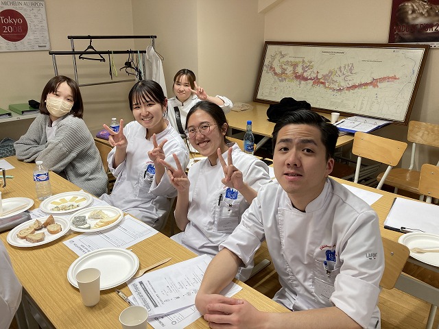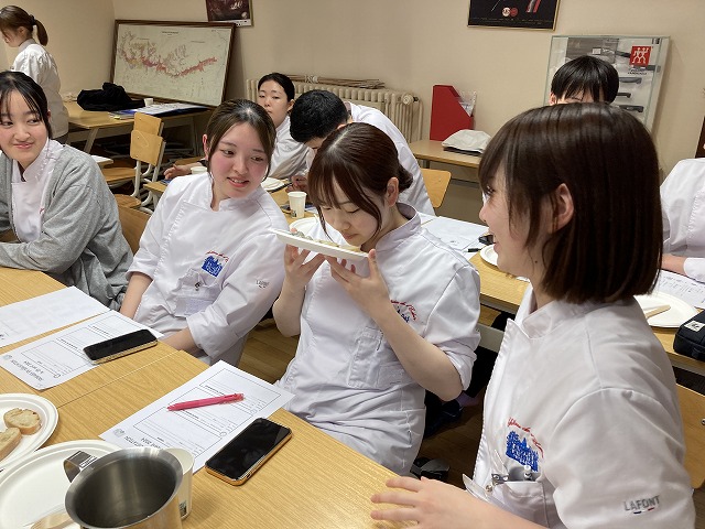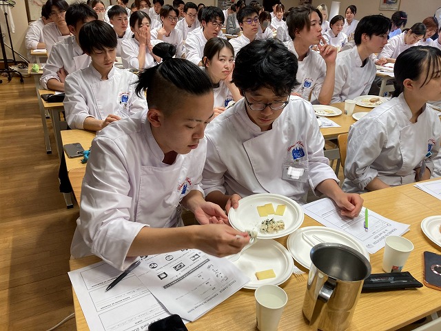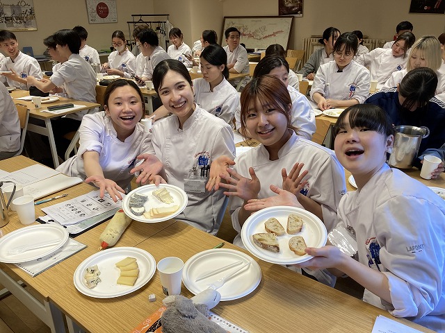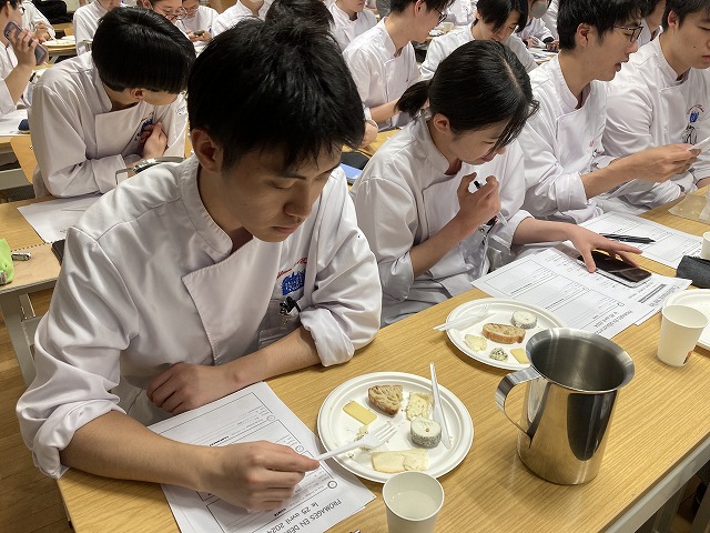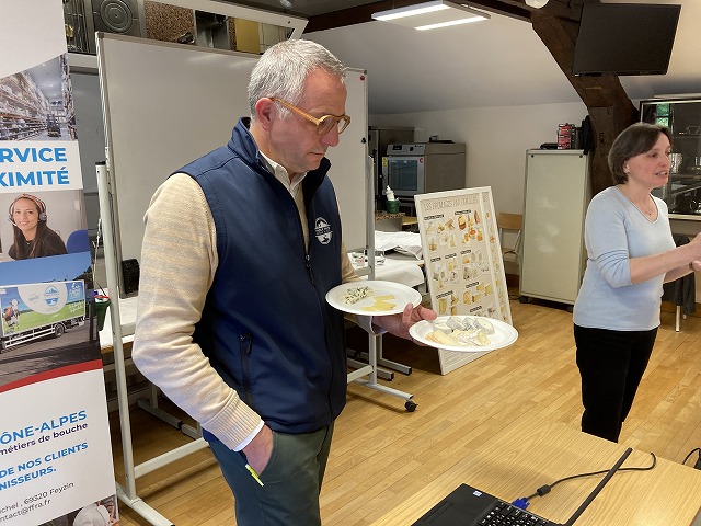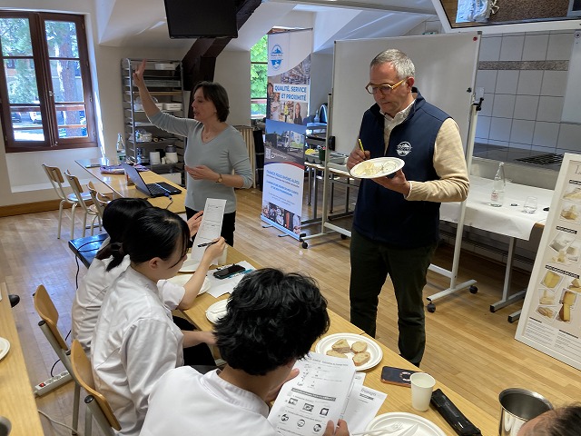 フランスの食生活に密着したチーズについて、今回の専門講習では学習しました。講師は「France Fraisフランス・フレ」という主に乳製品を扱う食材会社から来校くださったChristophe BECHATクリストフ・ベシャ氏です。ベシャ氏はこちらの会社でマーケティングやチーズの商品開発に関わるコンサルティングも行っています。講習ではチーズのスペシャリストのベシャ氏からチーズに関する基礎を学び、試食も行いました。