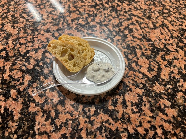 また、試食としてトリュフをたっぷり加えた山羊のフレッシュチーズを研究生たちに提供していただきました。トリュフを混ぜ合わせてから20時間おいているので、トリュフの香りが口いっぱいに広がりました。トリュフは卵、バター、フロマージュなど脂質を多く含んでいる材料との相性が良く、料理として合わせられることがよくあります。