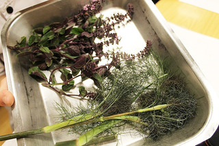 ラバレの身を3枚に卸して皮をはぎ、塩とピマンドエスプレッドと呼ばれる唐辛子を少量まぶして、低温60℃で15分火を通します。それに2週間漬け込んだ自家製の野菜のピクルス(ビーツ、オニオン、カリフラワー、ういきょう、セロリ、アティーチョークなど)を付け合わせで盛り付け、レモンの角切りを散らし、さらに自家菜園で採れた香草や食用花を飾ります。アクセントにレモン風味のキャラメル、オリーブ油をかけ、仕上げに普段レクレール校で使っているのとは違った風味のあるポワーブル・ティムとよばれるこしょうを振りかけます。