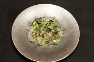 おろしただけのラバレを皮つきのまま塩で1時間ほど漬け込んだ後に、10分ほど水で塩抜きをします。しっかりと水気をふき取り、薄くスライスし皿に並べ、その上に同じ処理をしたラバレの角切りとレモン汁、しょうがのみじん切り、オリーブ油でマリネしたものを散らします。そして、青リンゴの角切り、オニオンセベット(あさつき)、野生フヌイユの葉、野生のバジルの葉を添えます。かつて訪れたことのあるメキシコのセビーチェという街を思いながら作られたそうです。
