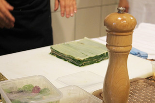 付け合わせとして、サボォア地方特産であるふだん草に火を通したものと、こちらも同じ地方の名物であるポーモニエ(pormonier)と呼ばれるソーセージ(ふだん草、豚肉、ポロねぎ、ほうれん草で作られたソーセージ)のミルフィーユ仕立てを紹介されました。