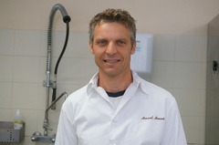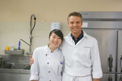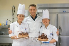 エスコフィエ校製菓コース初めての外来講習は、「パティスリー・モネ」オーナーシェフ、アルノー・モネ氏に来て頂きました。リヨンの東、電車で約20分の小さな町Montluel(モンリュエル)のお店は地域密着型のパティスリーです。現在研修中の2016年春コース生の石田さんも一緒に来校してくれました。