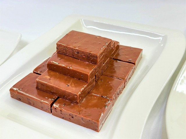 口に入れるとすぐに溶けはじめるような柔らかさで、キャラメルとチョコレート、両方の味わいを楽しむことができます。食感として、砕いたローストカカオを加えています。