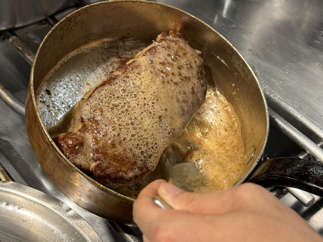 今回使用したお肉はサーロインでもリブアイと呼ばれる比較的脂肪が少ない部位を使いました。肉にフルール・ド・セルとこしょうを振り、バターで表面に焼き色をつけながら加熱し途中でバターをかけて肉の表面が乾燥しないように火を通していきます。