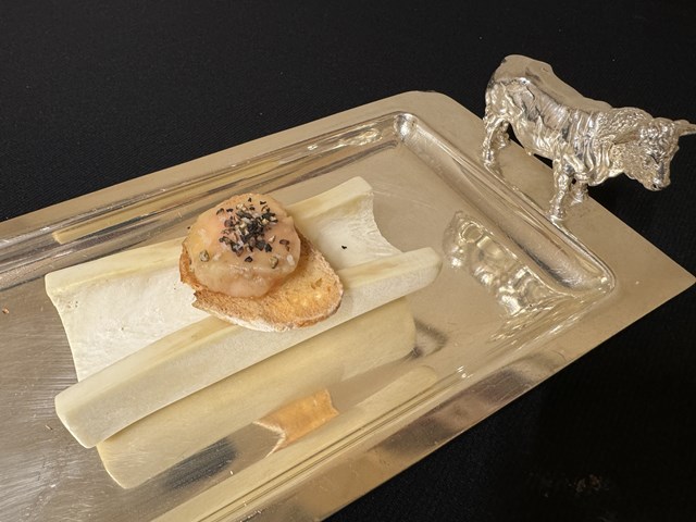 さらに別皿で縦半分にカットした牛のすね骨を器に見立て、クルトン、骨髄を軽くゆでたものに、フルール・ド・セルと黒こしょうを振りかけたものを盛りつけます。