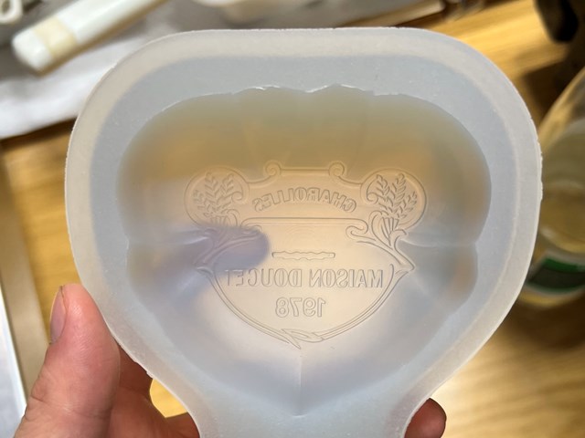 そして生クリーム、牛乳、ホワイトチョコレート、ゼラチン、7分立てにした生クリームを合わせて牛乳のムースを作り、それをお店のロゴが入った専用の型に流し入れ、中に先程冷やし固めた生地とムースの層を入れてしっかりと冷やし固めます。型からはずし、カカオバターとホワイトチョコレートで作った霧状のチョコレートを表面に吹きかけてコーティングしていきます。