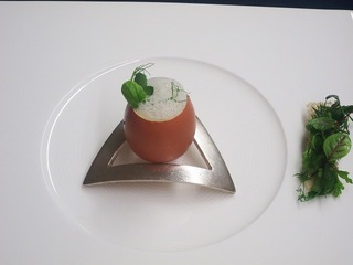 最初のお皿として、香りと旨みが濃縮された料理です。卵の殻を器にしてアーティーチョークのピューレ、