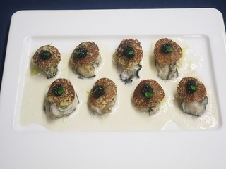 バターの風味豊かな柔らかいポロネギに牡蠣のジュースでサッと火を通した(身がぷっくりすればOK)牡蠣を置きます。牡蠣風味のソース・ヴァンブランをかけて、セロリのフライを添え、そば粉のガレットとキャヴィアを飾ります。