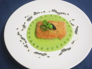 淡水魚の中でも高級魚であるフェラを使った一皿です。火を通すと繊細で崩れやすい柔らかな身をしています。カダイフと呼ばれる細いパスタのような生地を表面につけて焼き上げます。表面はサクッと中はふっくらとした状態です。グリンピースの滑らかなピューレと一緒に盛り付け、ソース・ヴァンブランをベースにフレッシュの牡蠣を加えてハンド・ミキサーで撹拌したものにキャヴィアを混ぜ込んで、味のアクセントにしています。