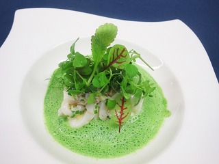 牡蠣風味のソースをベースにクレソンを加え鮮やかな緑のソースで、磯の香りがしっかりしてクレソンの辛みとバランスが取れています。蒸した平目の上にレモン汁と、オリーブ油でマリネした帆立貝、牡蠣を刻んでのせます。魚介と風味の相性が良い香草サラダをたっぷり盛り付けて提供します。