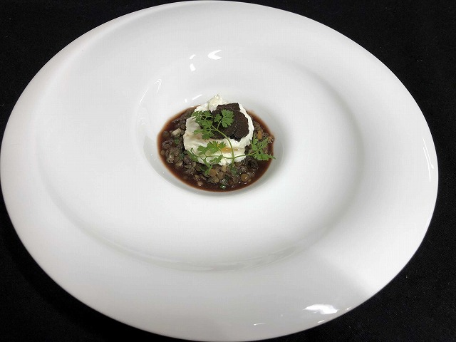 レンズ豆の煮込みとポルト酒をベースにしたトリュフ風味のソースを使った一品です。