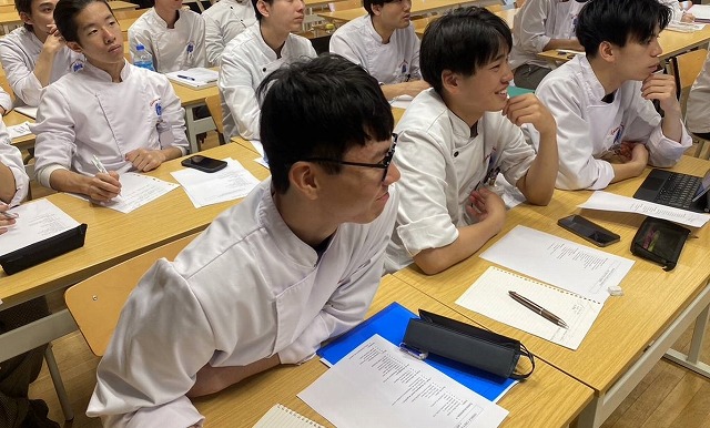 それぞれの調理法は珍しいものではありませんが、それぞれの材料に対して生かすための考え方や調理法など、シェフのエスプリをたっぷりと聞き、学生も興味を持って講習を受けています。