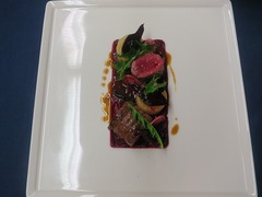 シカ肉に、根菜とオレンジベースの薬味を添えた一品です。