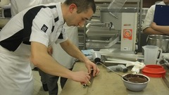レストランで使うチョコレートの量はパティスリーに比べるとボリュームも少なく、細工をする量があれば十分。また、作業場では室温も高く、場所も少ないためこの手法が作業性や効率がいいとのこと。