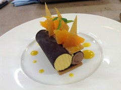 マンダリンのパルフェにアールグレイが香るチョコレートムース。そしてサブレやチュイルにもマンダリンを加えることにより、マンダリン感たっぷりの一皿に仕上がっています。