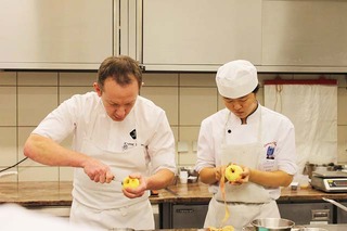 シェフの隣でリンゴの皮むき、クリームの絞りなどシェフとコミュニケーションを取りながら積極的に助手をしていました。