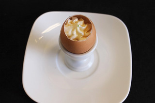 卵の上の部分だけを割り、全卵を取り出し、卵黄だけを戻し、お湯の中で2分ほど火を通します。