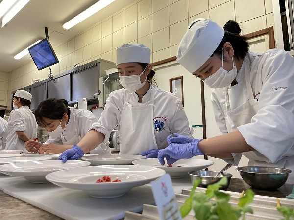 研究生が実習で作成しているお菓子はパティスリーで販売できるものですが、レストランデザートならではの繊細な食感や氷菓が楽しめる一品です。