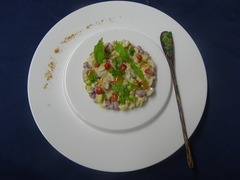 貝類、カリフラワーなど食感が異なる食材をマヨネーズでまとめ、グリーンカレーの香りや辛み、ザクロの実の食感、グラニースミス(青リンゴの一種)のジュレ、シトロン・キャビアの酸味でまとめた清涼感ある一品です。