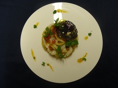 米状のパスタで作ったリゾットを添え、肉の旨みをが入ったトマト入りのドレッシングで味をつけ、食感のよいイカ墨入りじゃがいもの入ったチュイルを添えた一品です。